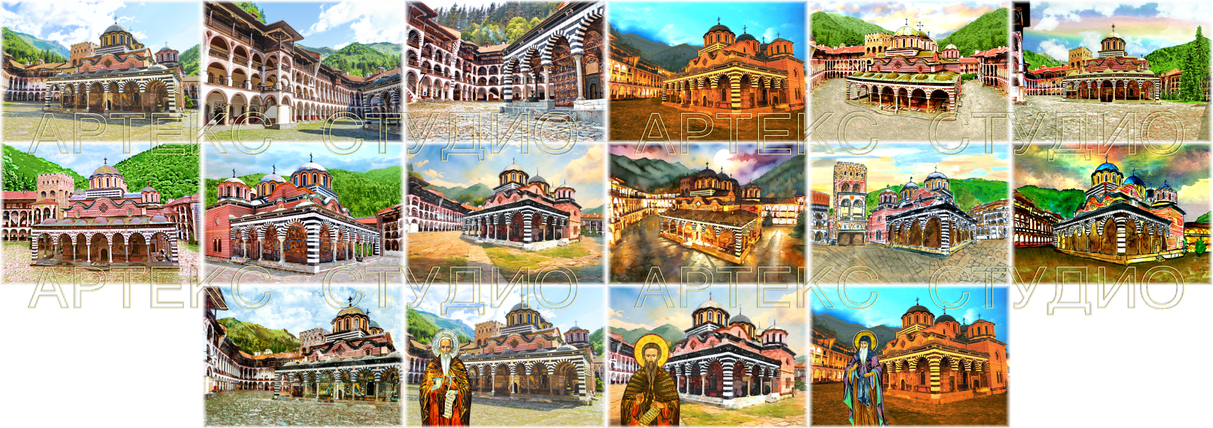 Всеки изглед от Рилски манастир може да бъде поставен към всички продукти. Кликвайте върху тях, за да видите разнообразието.